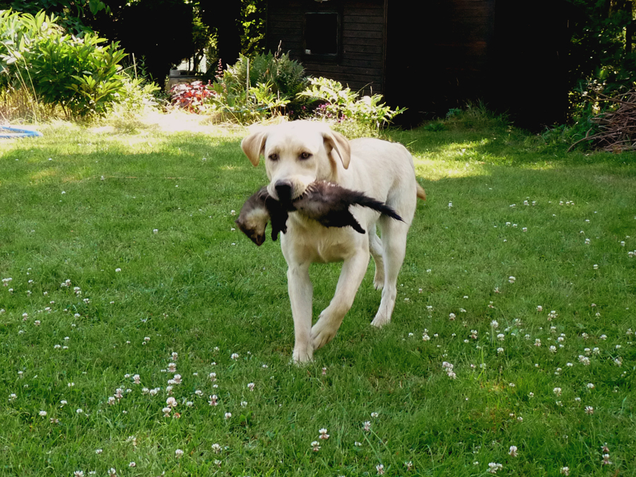 Durch dicht bewachsenes Ufer bringt er schon, kaum dem Welpenalter entwachsen, die erlegte Ente seinem Führer und im Alter von ca. 10 Monaten ist der Apport von Marder, Waschbär oder Fuchs,notfalls über Hindernisse, kein Problem. Ebenso gern arbeitet er mit Dummies und holt sie auch vom Baum. Und dazu, was ein Retriever alles bringen kann, hat er seine ganz besondere Ansicht.